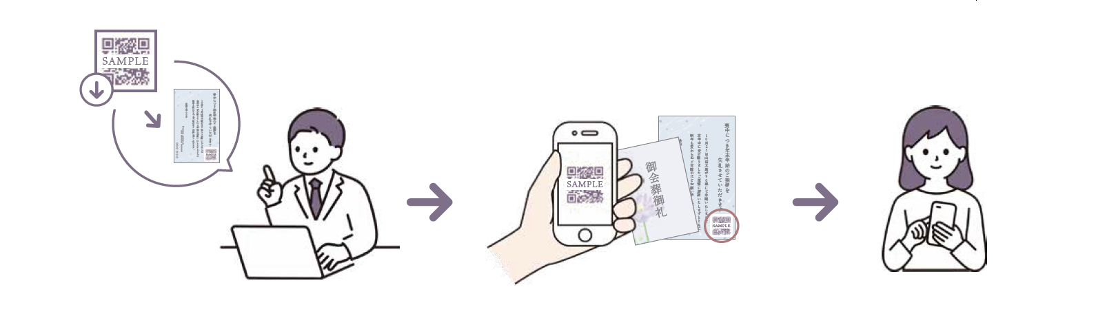 例えば、発行したQRコードを会葬礼状に印刷することで、お通夜や葬儀に参列した方はもちろんのこと、四十九日までの間に自宅へご焼香に来られた方にもメモリアルムービーを視聴していただくことができます。